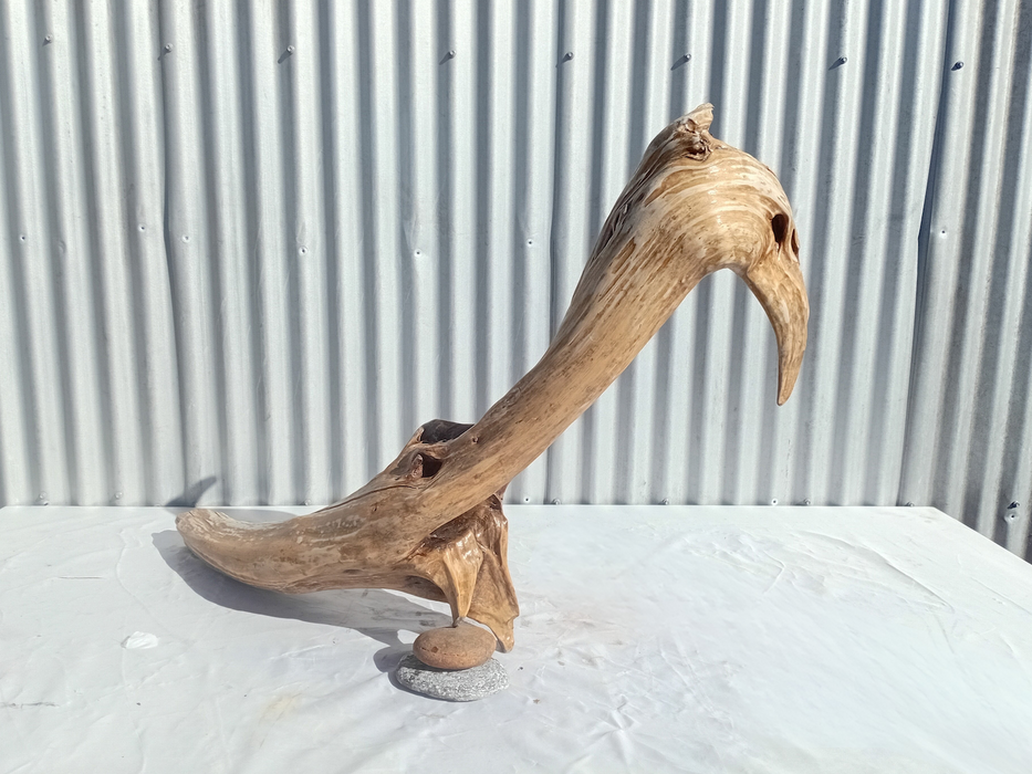 The graceful form suggests the quiet elegance of a swan in motion. The sculpture can be displayed free-mounted or rock balanced, allowing the piece to be positioned in a variety of ways while revealing different perspectives of its flowing shape.